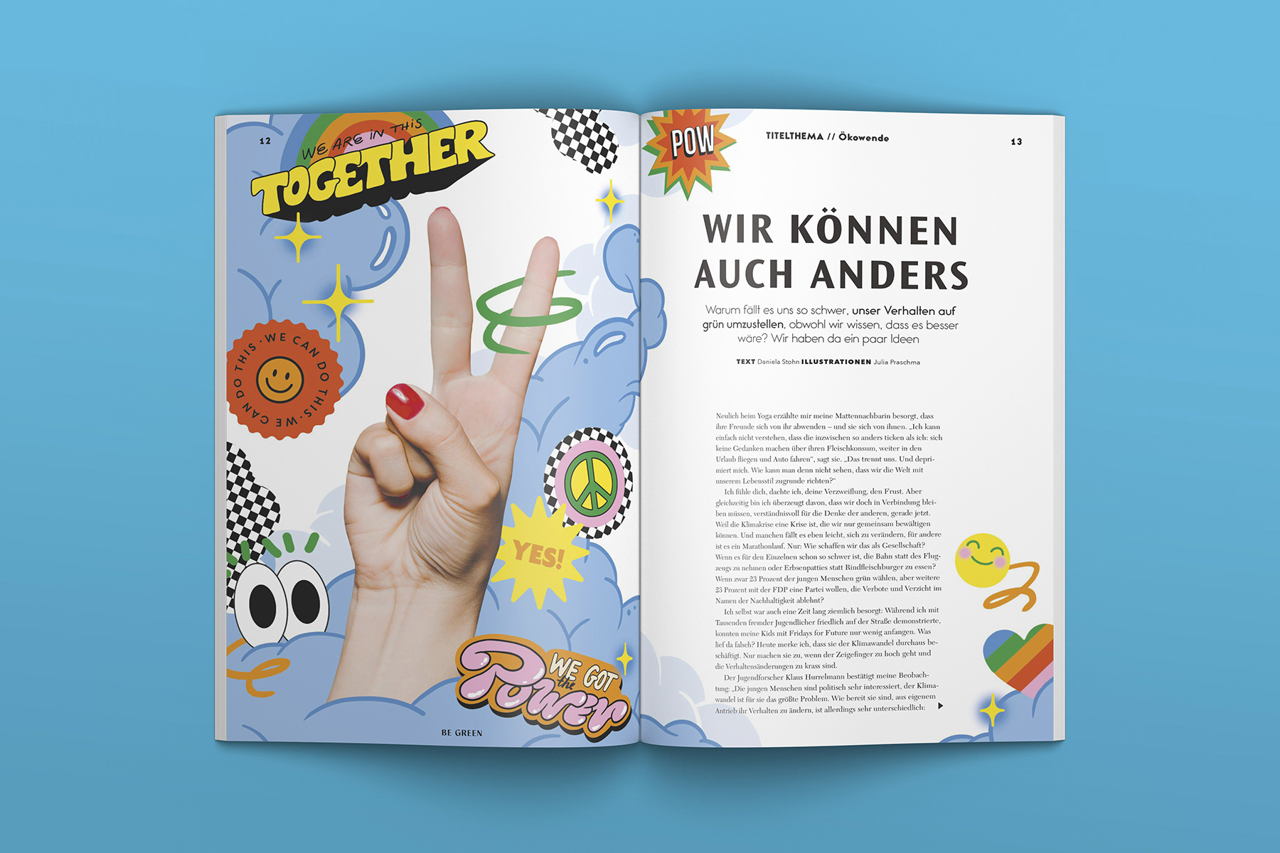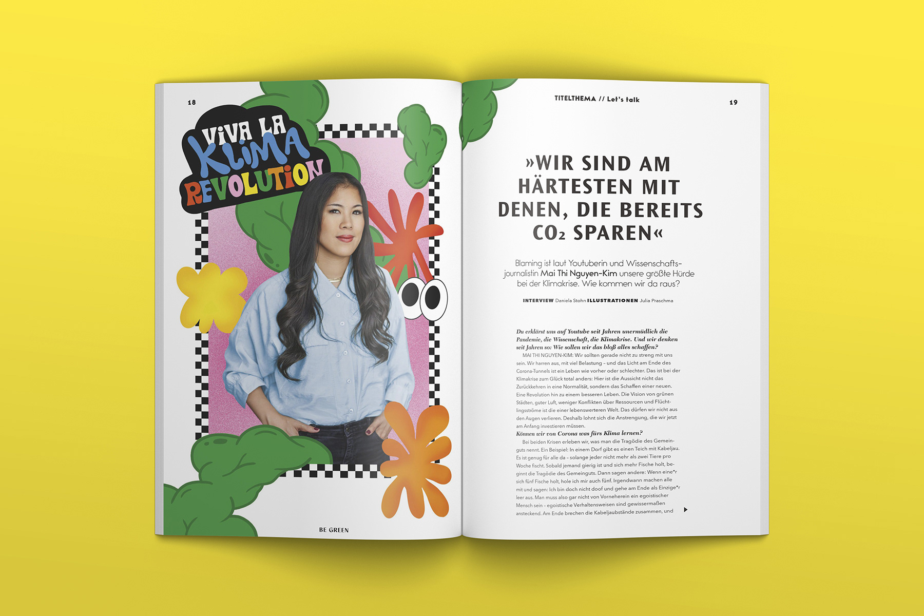 Brigitte_Be Green is a magazine with the focus sustainability, climate and green topics. They asked my to create visuals with a positive vibe that are making clear, we are all in this together and it needs a positive attitude to stay motivated. Additional to that they wanted the portrait of Mai Thi Nguyen-Kim illustrated. Mai Thi is science journalist and chemist. Moreover author and YouTuber of her channel 'maiLab' and moderating in German TV channels ARD and ZDF. She is explaining science and lots of topics connected to that in a very understandable way. Beside the fact that she's a really cool & tough woman. Additionally I had an awesome brief and lots of fun working on that project.