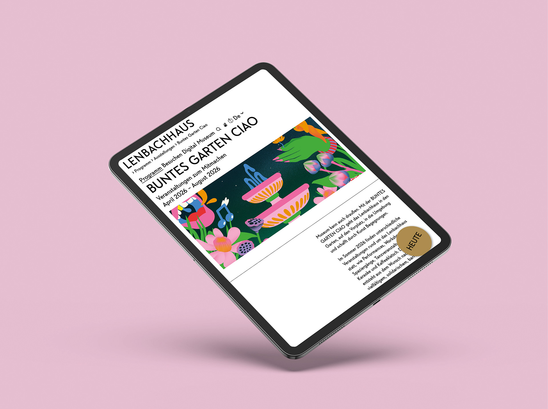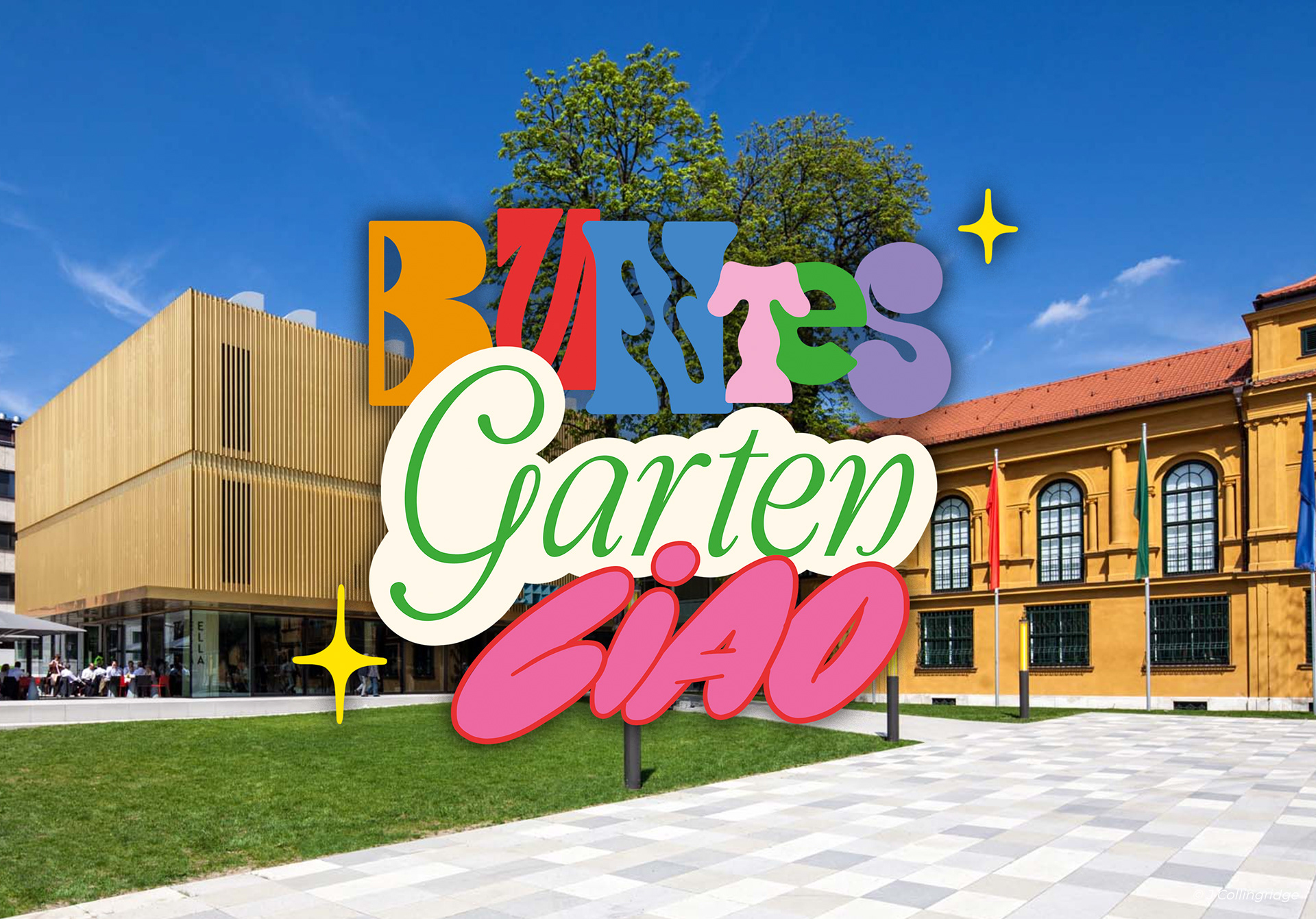 Mit BUNTES GARTEN CIAO wird das Lenbachhaus in München im Sommer 2026 zum offenen Kunstraum im Freien: Garten, Vorplatz und Umgebung verwandeln sich in Orte für Kunst, Begegnung und Austausch. Freut euch auf ein vielfältiges, barrierefreies und solidarisches Programm mit Performances, Workshops, Spaziergängen, Tanz, Theater, Karaoke und Kaffeeklatsch – kostenlos und für alle. Zwischen Kunst im öffentlichen Raum, Klimaaktivismus, queerfeministischen Perspektiven und urbanem Gärtnern entstehen überraschende Begegnungen: Akrobatik trifft Mikrobiom, Pflanzen singen Karaoke, cyberfeministische Hexen flüstern gegen Ressourcenraubbau. Gleichzeitig wird der Vorplatz gemeinsam weitergedacht – mit mehr Schatten, Sitzgelegenheiten, Wasserbänken und Brunnen für ein klimagerechtes Miteinander. Das von mir entwickelte Corporate Design mit dem leuchtenden, spielerischen Key Visual zieht sich durch die gesamte Veranstaltungsreihe und macht Lust, dabei zu sein.